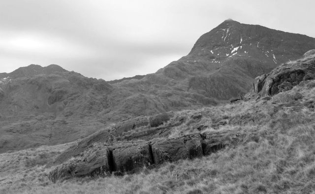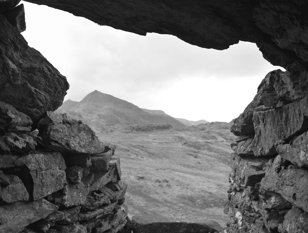 The view from inside The Cave. The main peak to the left is Crib Goch, with Snowdon just visible to the left (it appears lower, but is actually 532 feet higher).