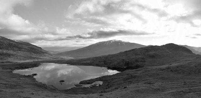 Llyn Cwmffynnon with the Cwmffynnon valley beyond. Mole Berfedd is the hill on the right, with Moel Siabod in the centre at the back. The hills of the Glyderau range are out-of-picture to the left.