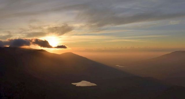 Sunrise over Cwmffynnon from Crib Goch, with the eastern Glyderau (left) and Moel Siabod (right) in the background. The patch of water towards the horizon on the right is Llynau Mymbyr.