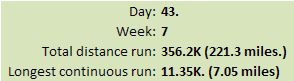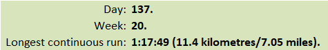 Day 199 (week 29). Longest distance run 21.1K (13.1 miles), longest time running 2:09:12.