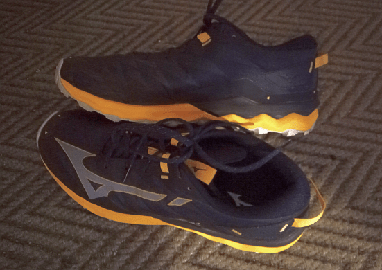 I have been running in slightly chunky things which were a cross between running shoes and hiking boots, which I originally bought with mountain walks in mind. I’m now the owner of a pair of Mizuno Wave Daichi 7 trail shoes – ‘trail’ means they’re for cross-country rather than road running, which needs a different kind of shoe. Immediately felt the benefit, unexpectedly running a near-five minute kilometre (5:09.7 to be precise) straight off.