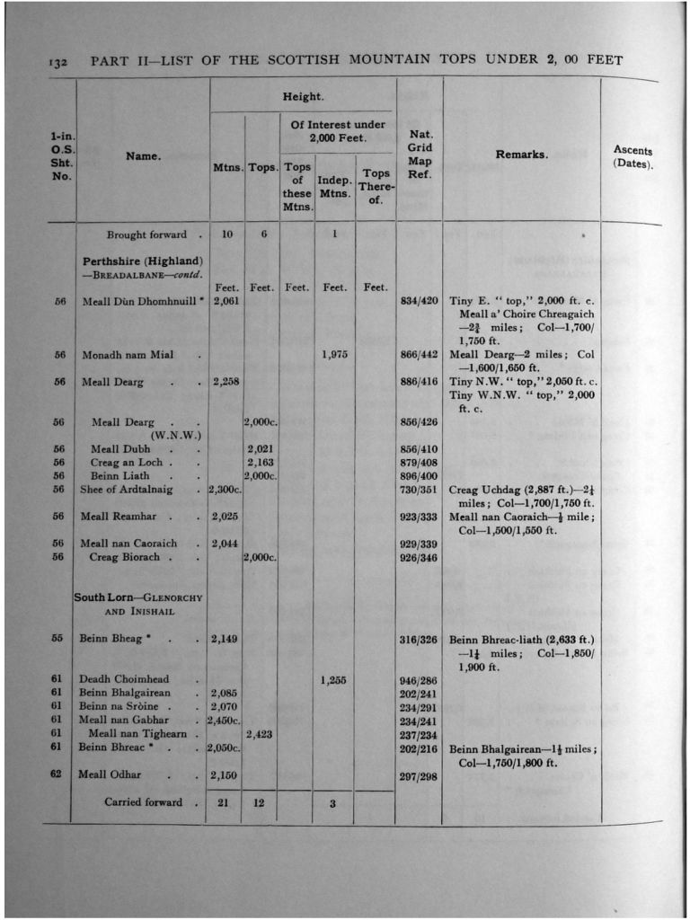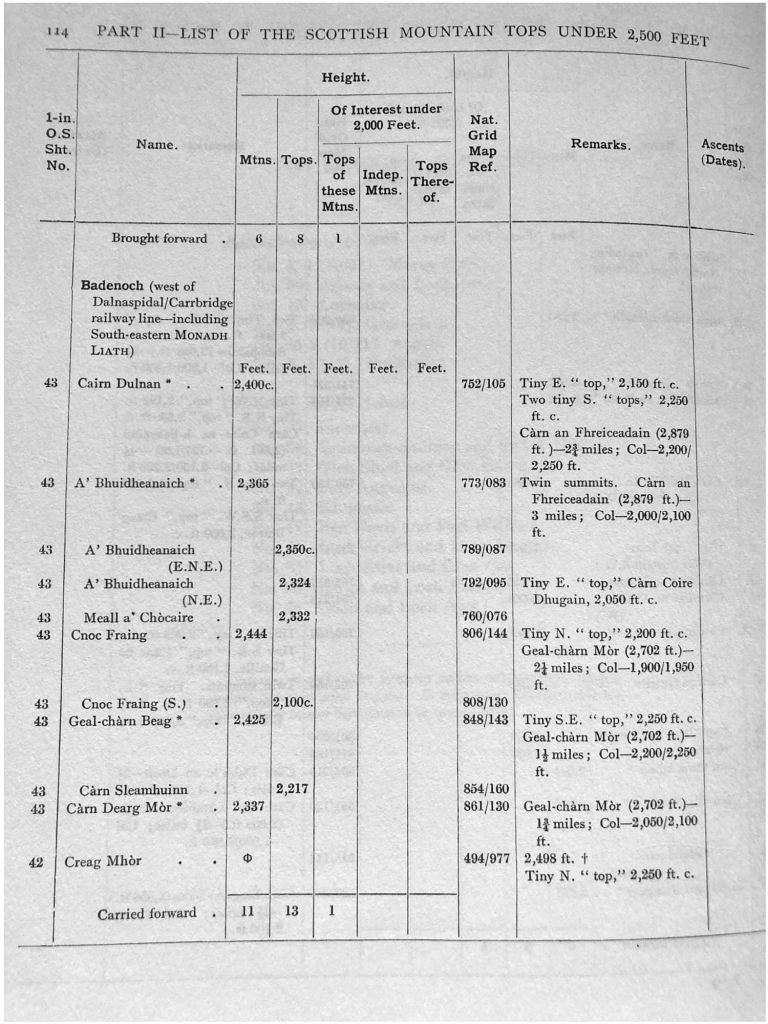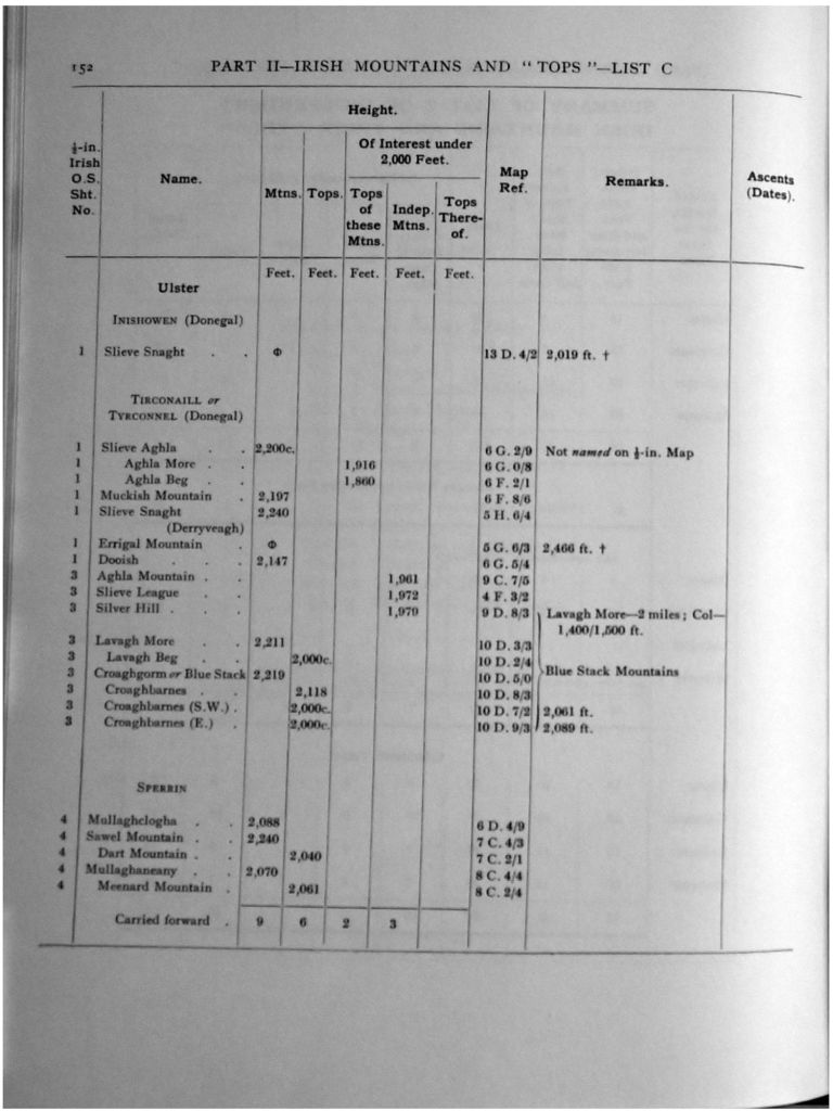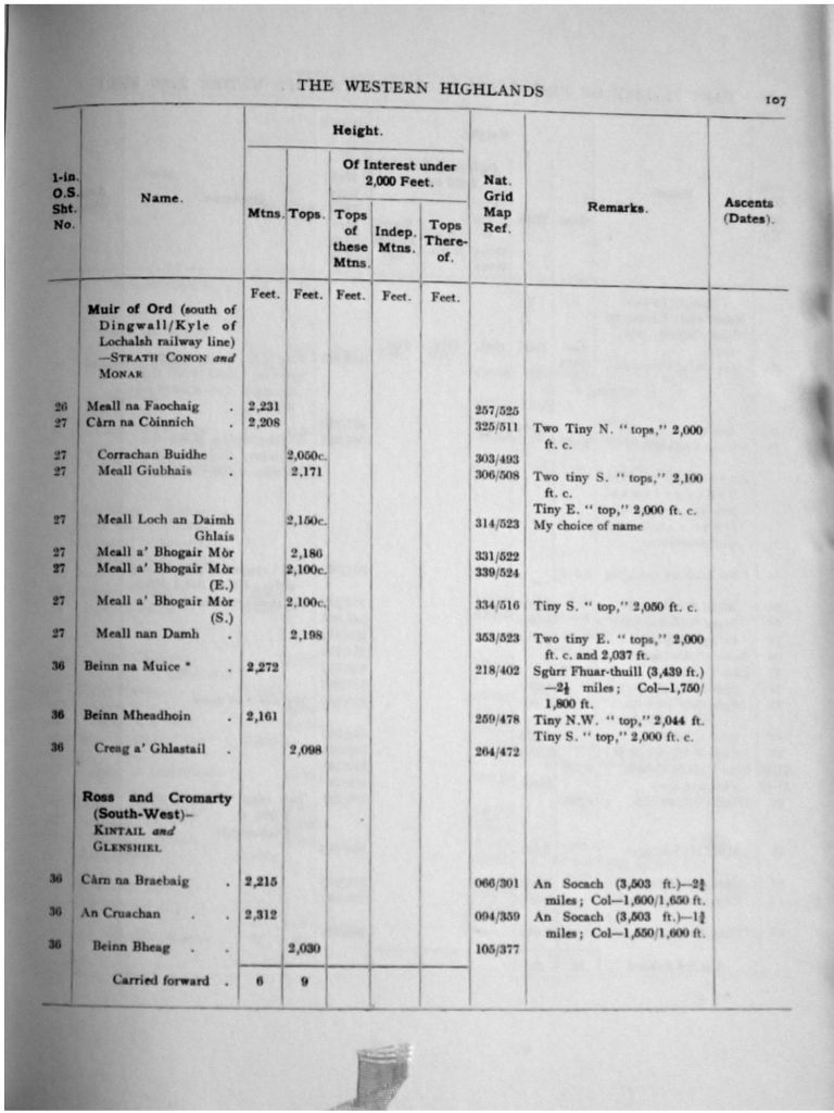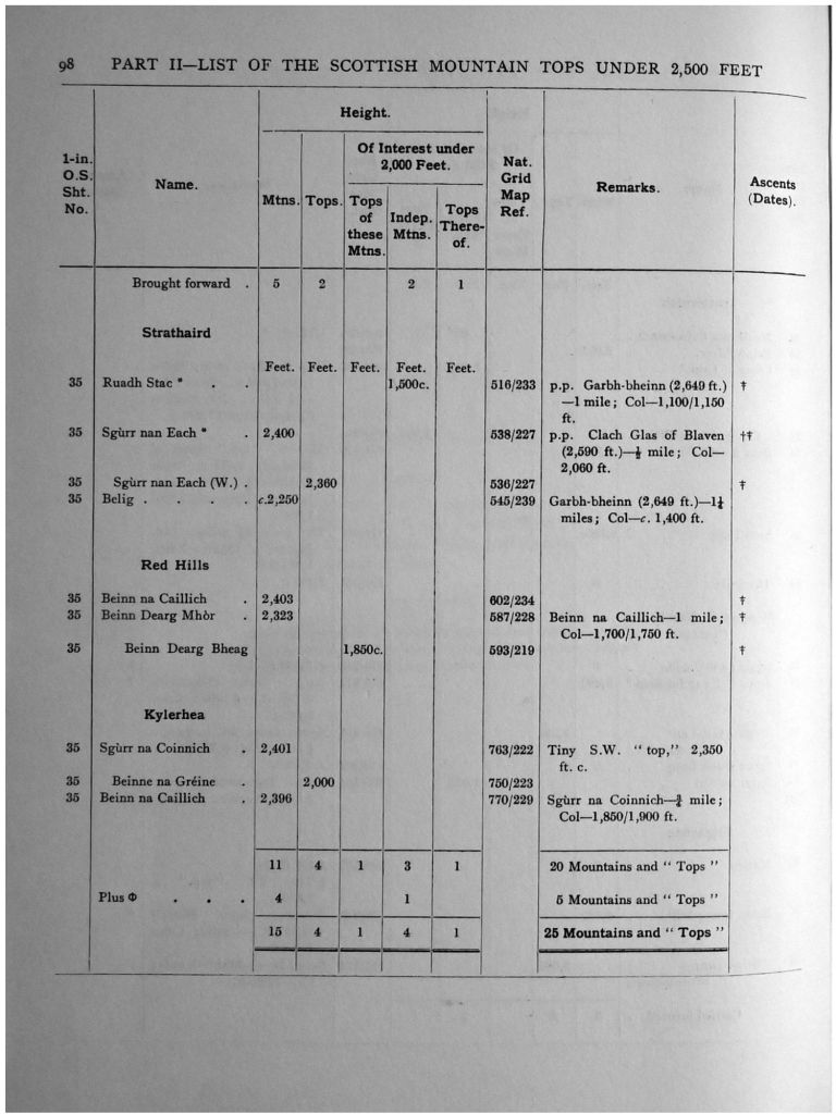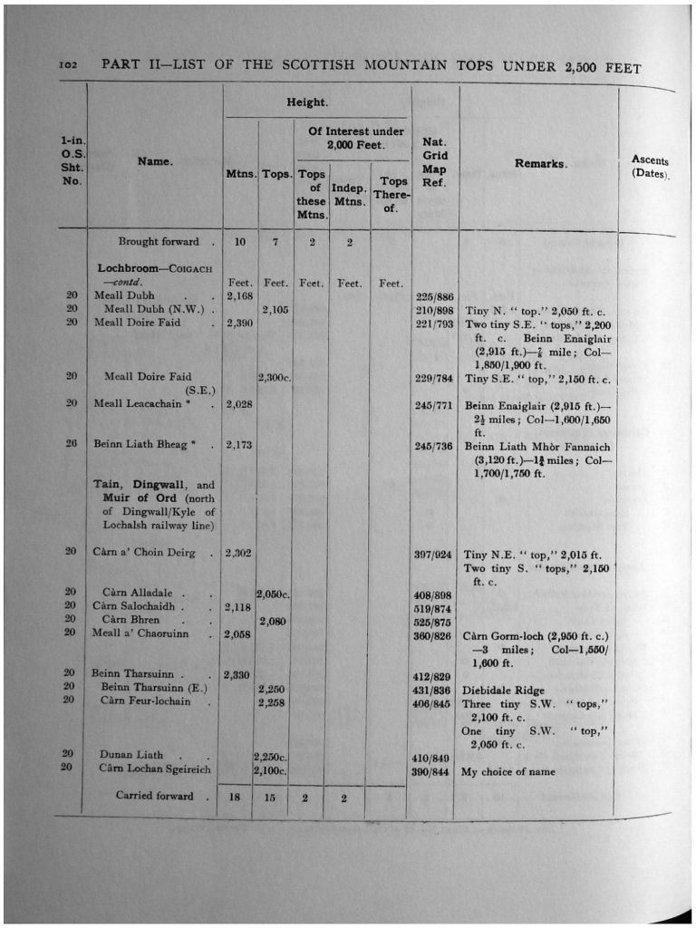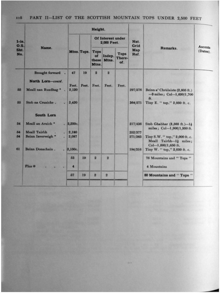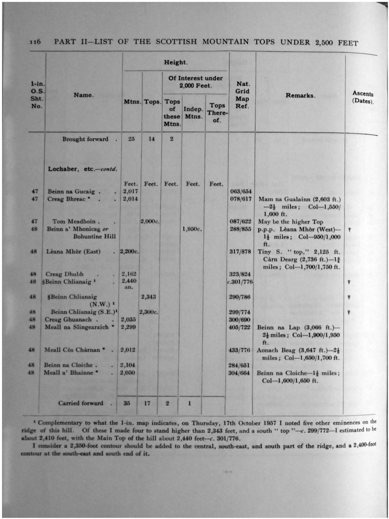 Source: Docharty, W. M. (1962) The Suppliment to A Selection of some 900 British and Irish Mountain Tops and A Selection of 1,000 Tops under 2,500 Feet – volume I. Edinburgh: Darien Press.