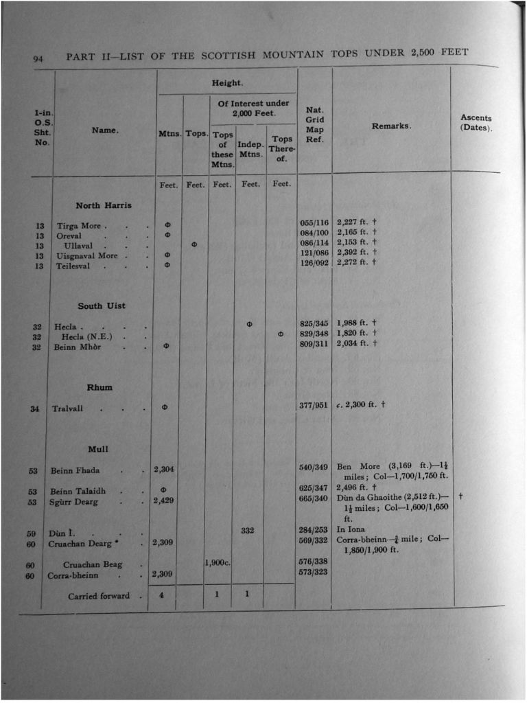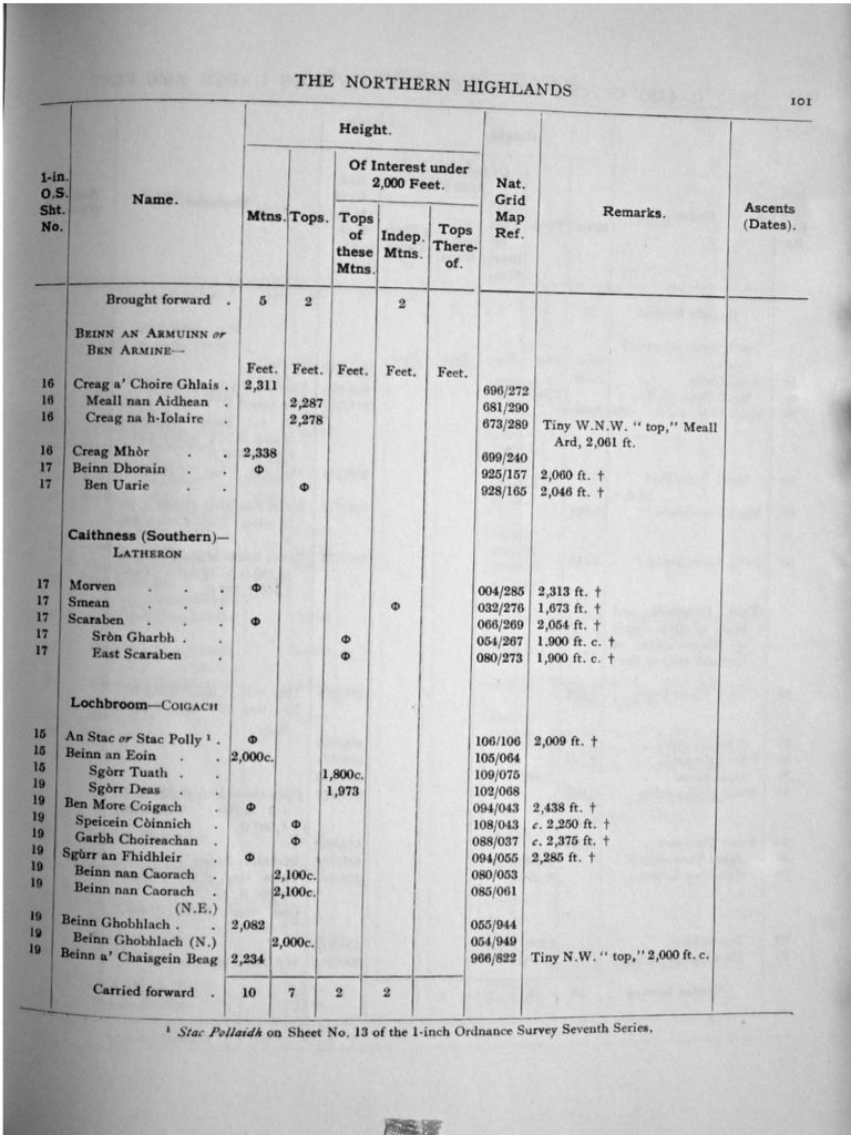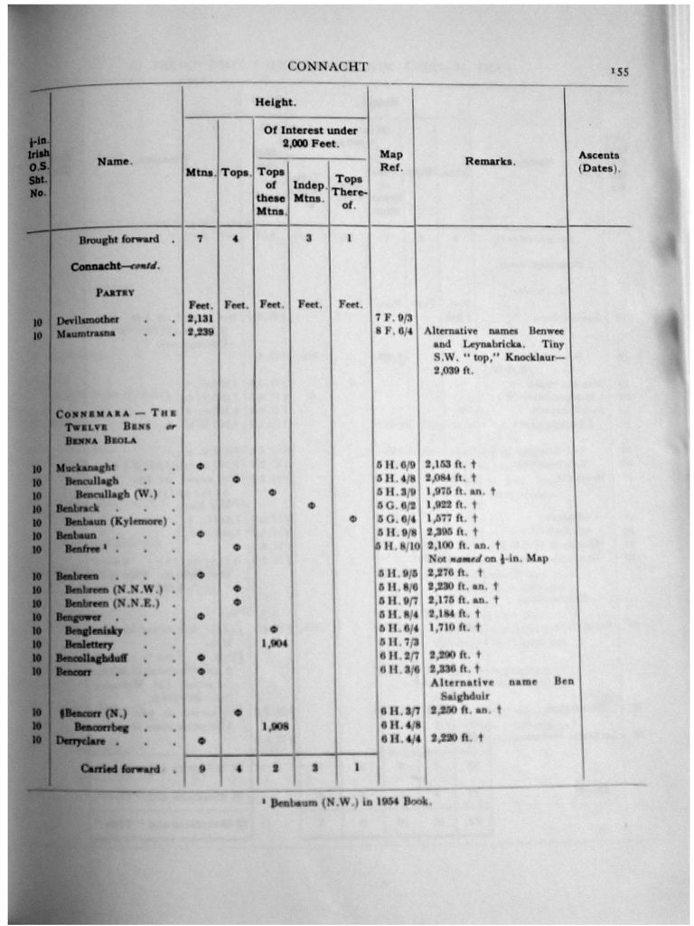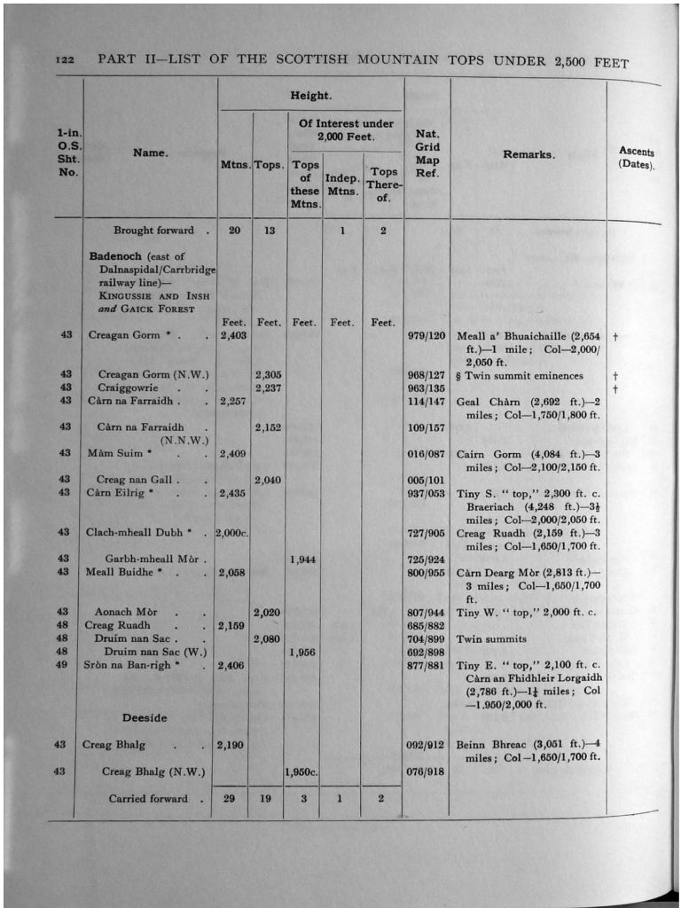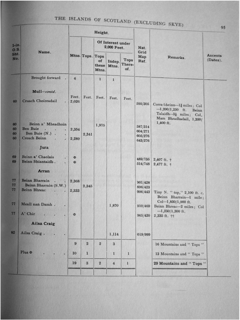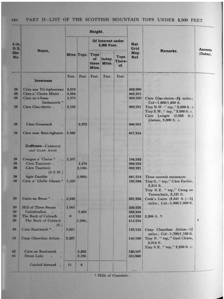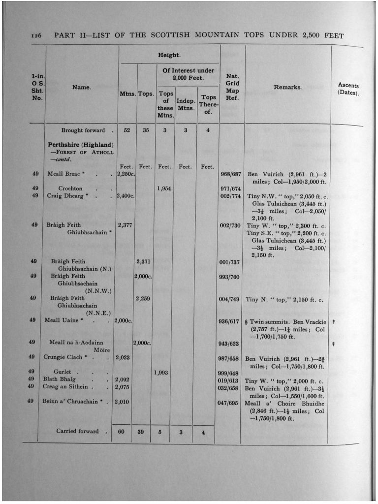 Source: Docharty, W. M. (1962) The Suppliment to A Selection of some 900 British and Irish Mountain Tops and A Selection of 1,000 Tops under 2,500 Feet – volume I. Edinburgh: Darien Press.